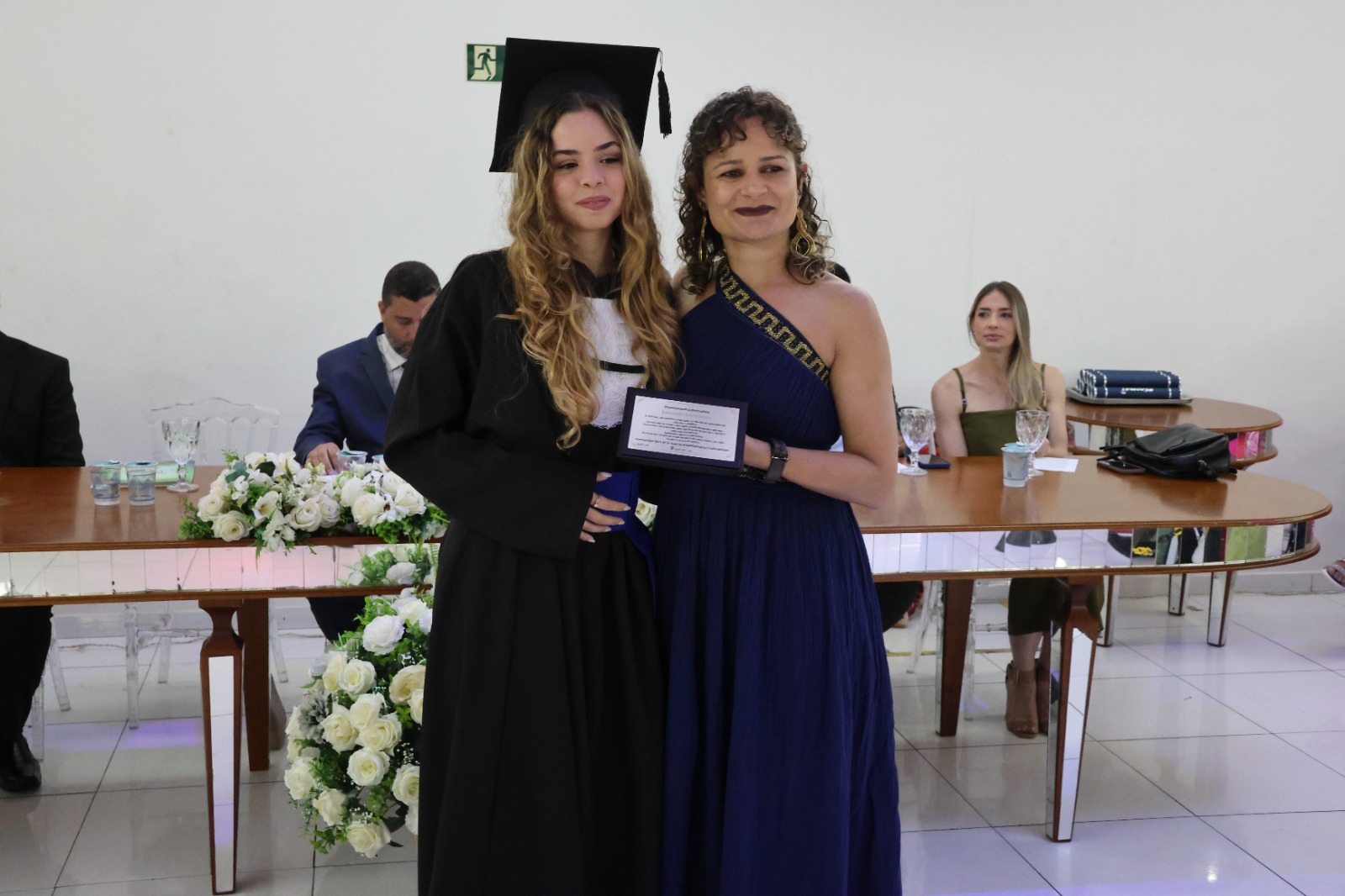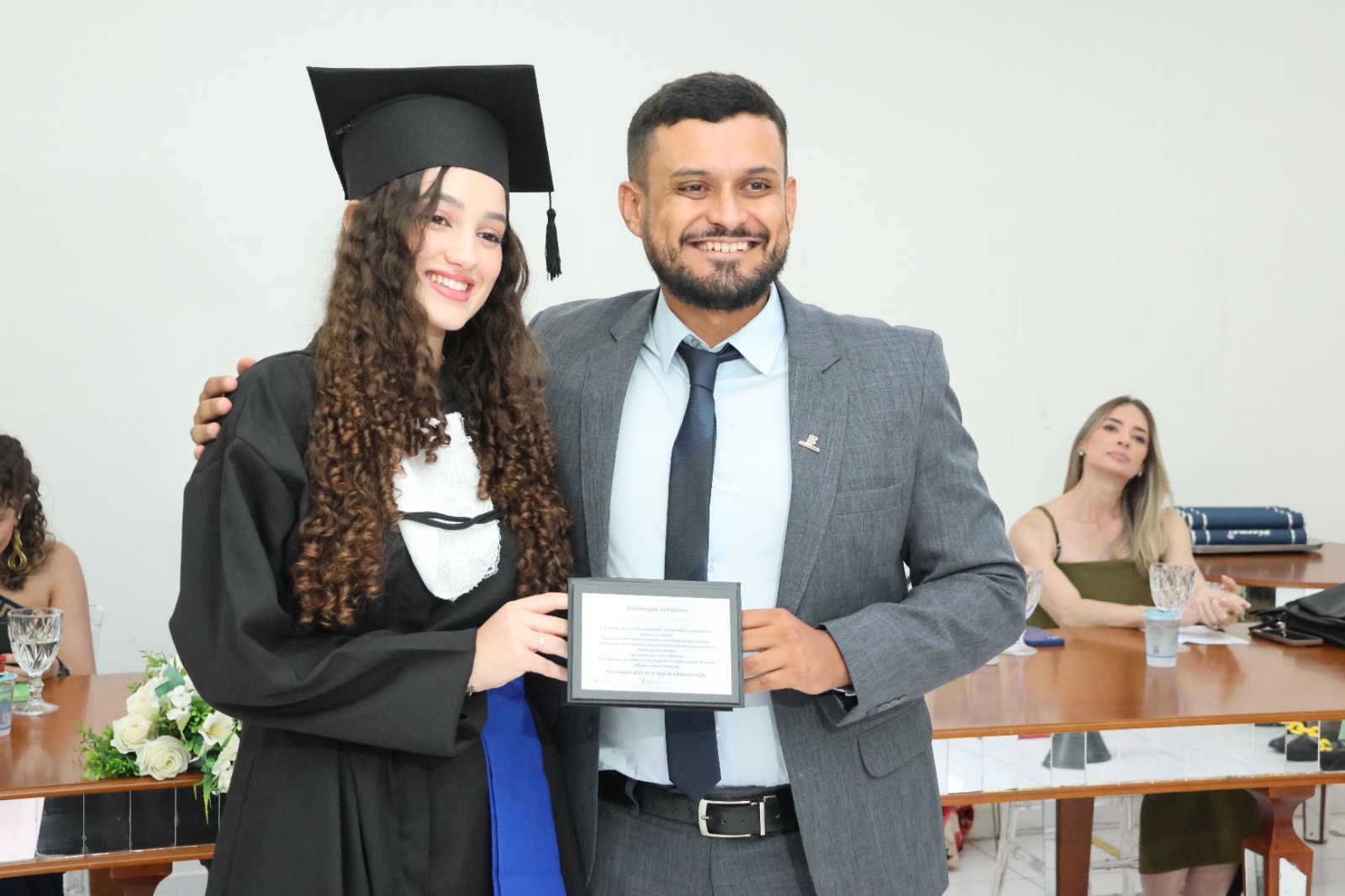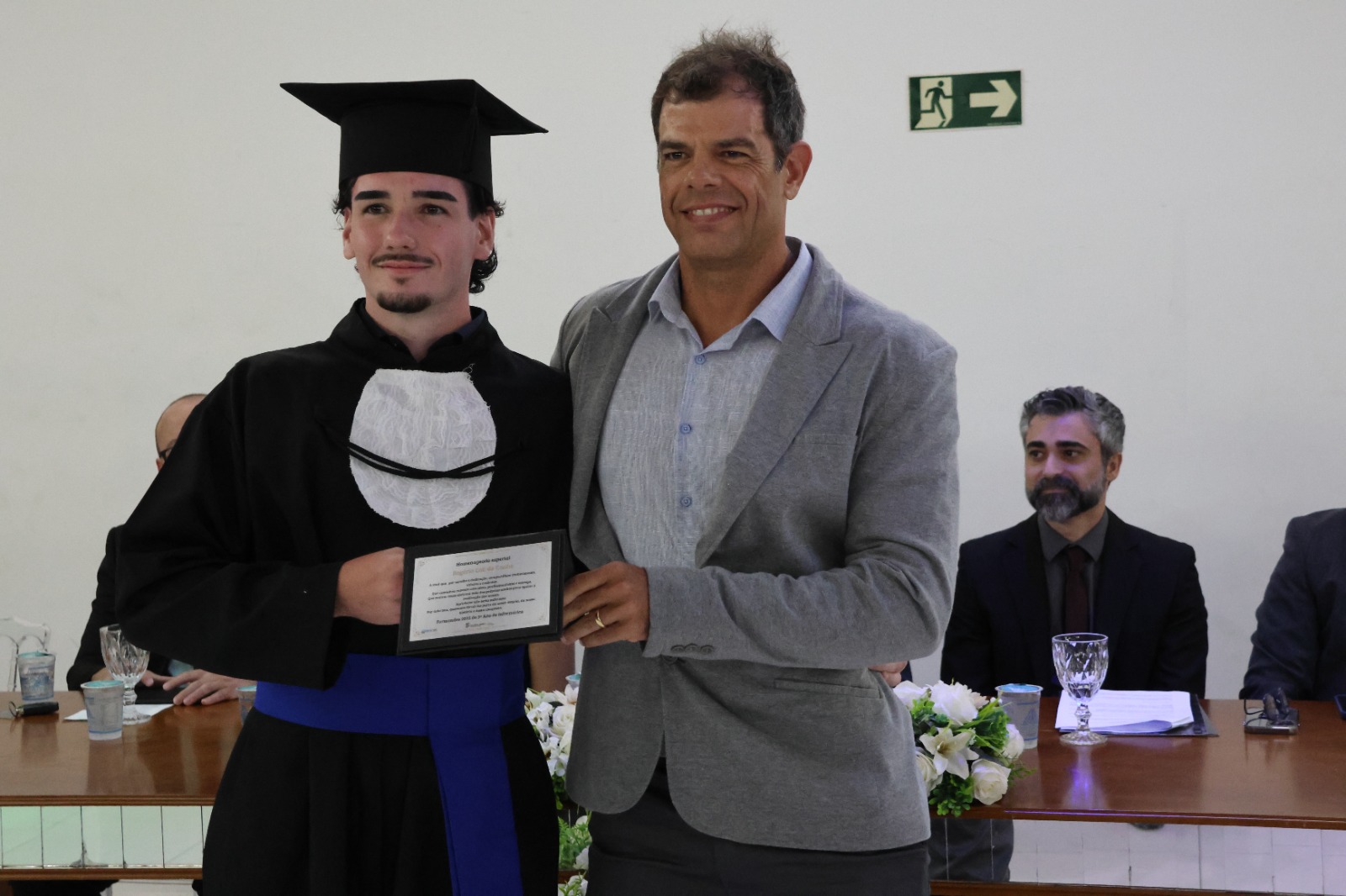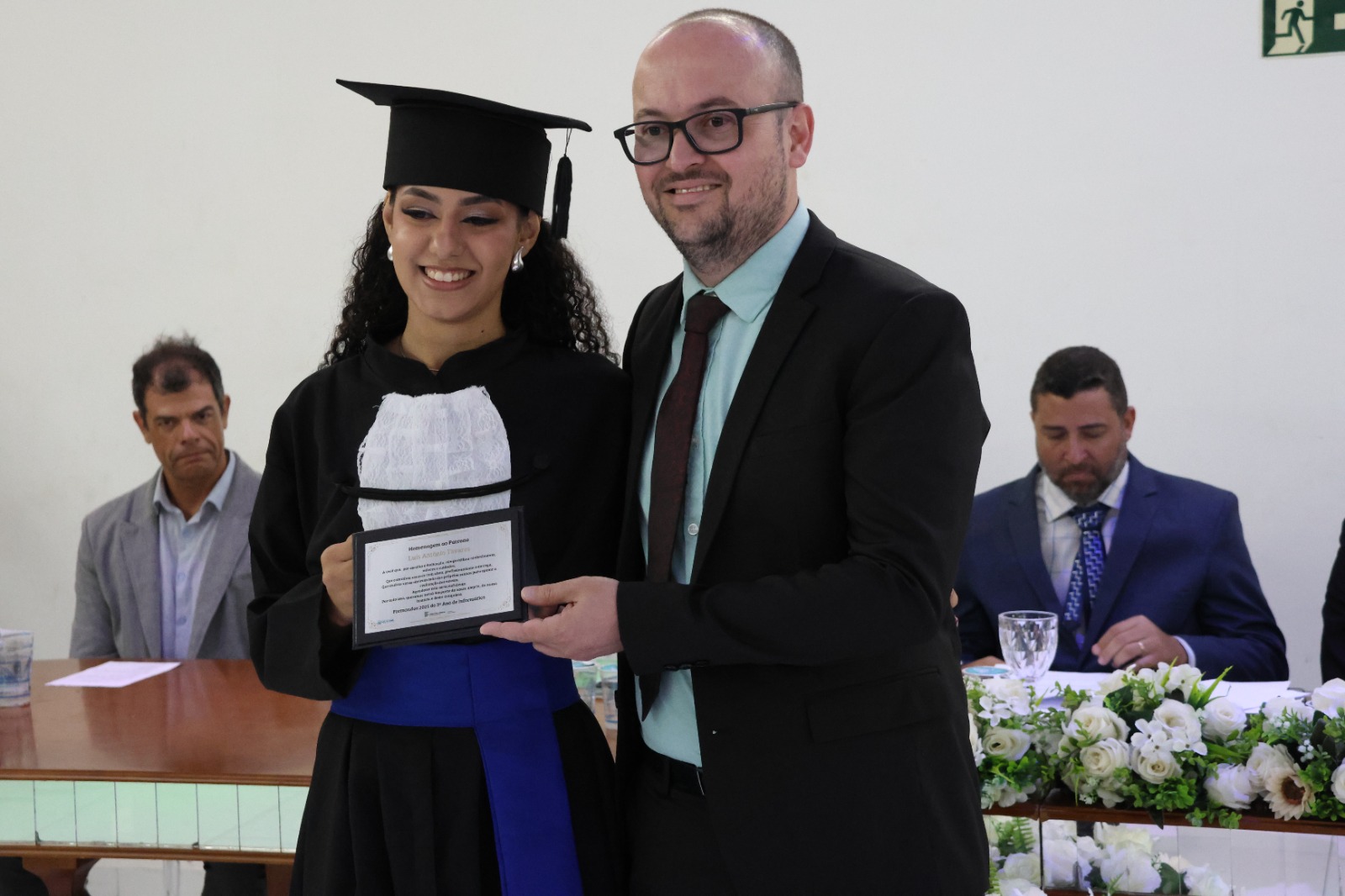 A Mesa Diretora da cerimônia foi presidida pelo Diretor de Desenvolvimento e Relações Institucionais do IF, Luis Adriano Batista, que representou o Reitor, Professor Cléber Ávila Barbosa. O evento também contou com a presença do Diretor- Geral, Professor Alexandre Fieno; da paraninfa das turmas, Professora Emanuelle Kopanyshyn; do Professor Leonardo dos Santos Maria, Patrono da turma de Administração; do Professor Luís Antônio Tavaraes, Patrono da turma de Informática; da Professora Danielle Martins Duarte Costa, homenageada da turma de Administração; e do Professor Rogério Coli da Cunha, homenageado da turma de Informática.