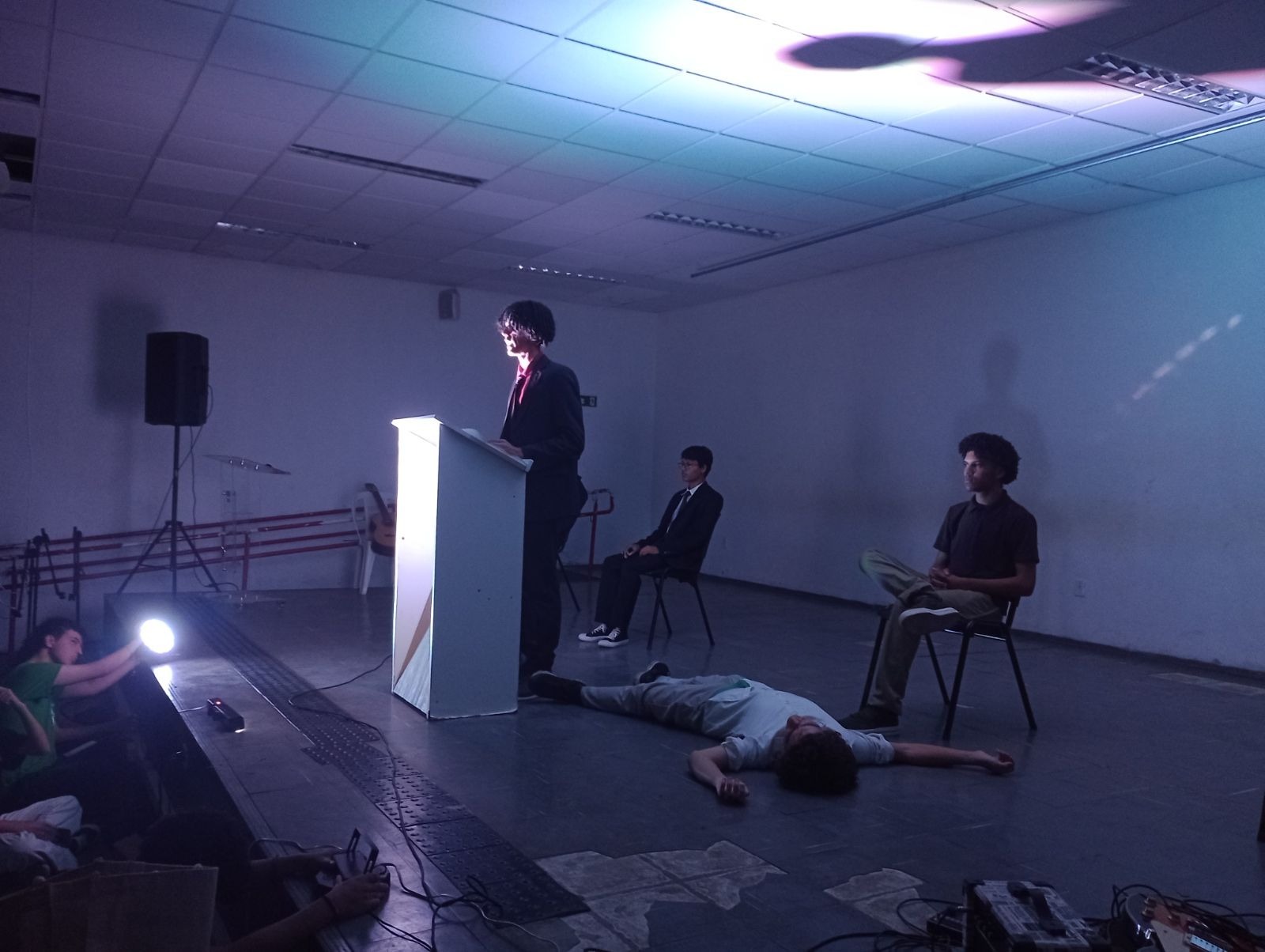 Teatro e Ativismo: A Cia dos Péssimos encenou o histórico discurso de Aílton Krenak na Assembleia Constituinte de 1987, seguida por um jogral de luzes baseado no poema "Índio, eu não sou", de Márcia Kambeba.