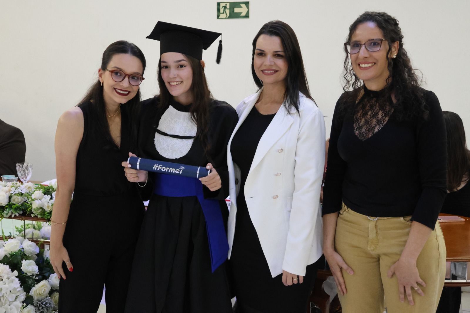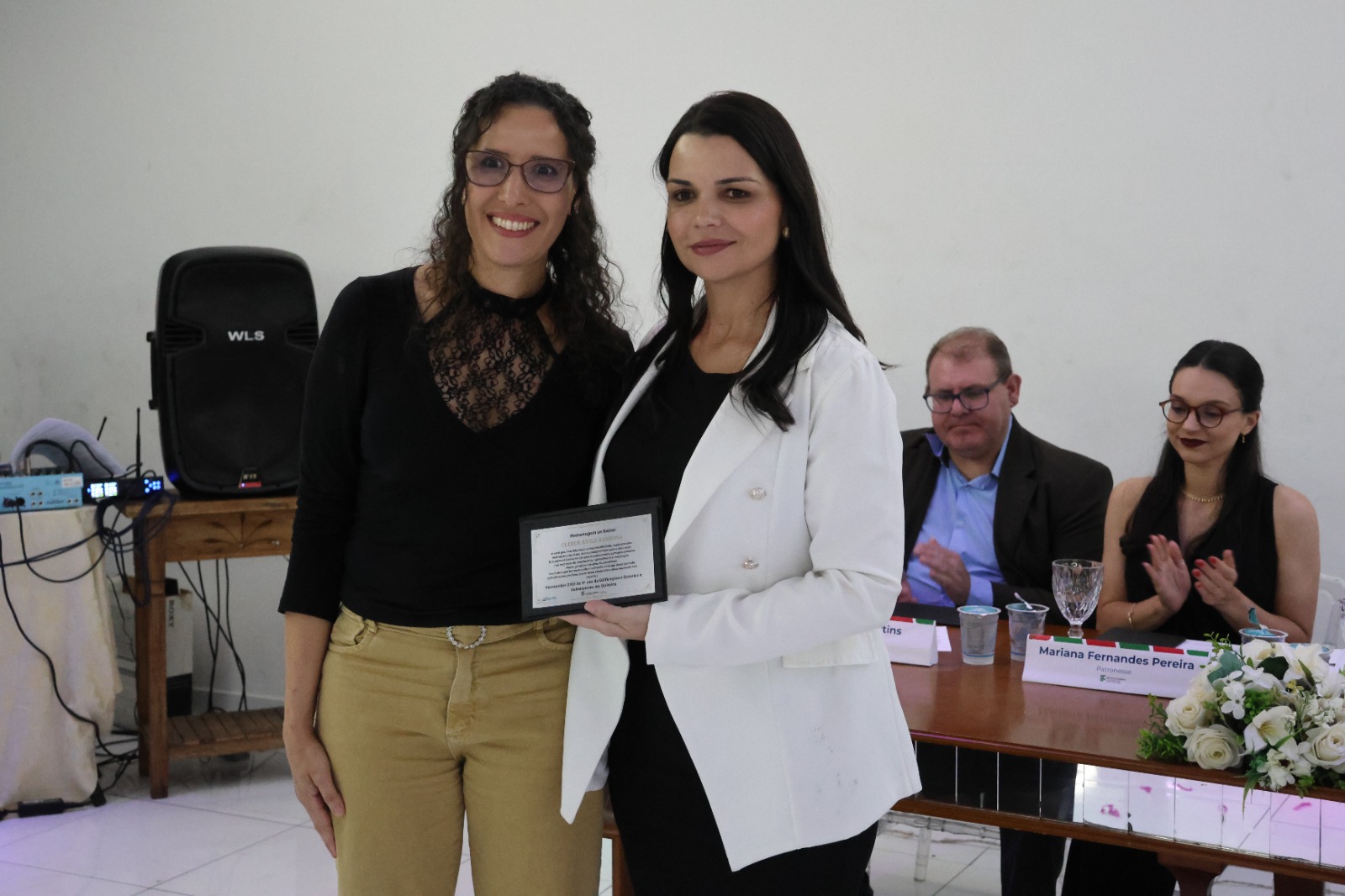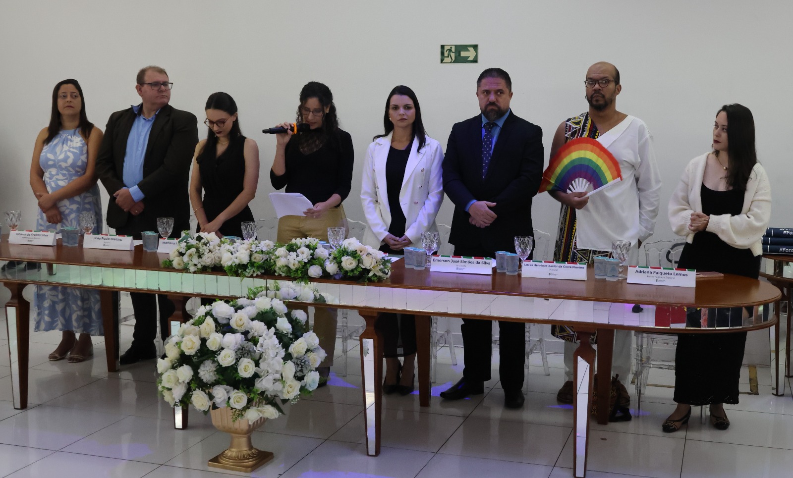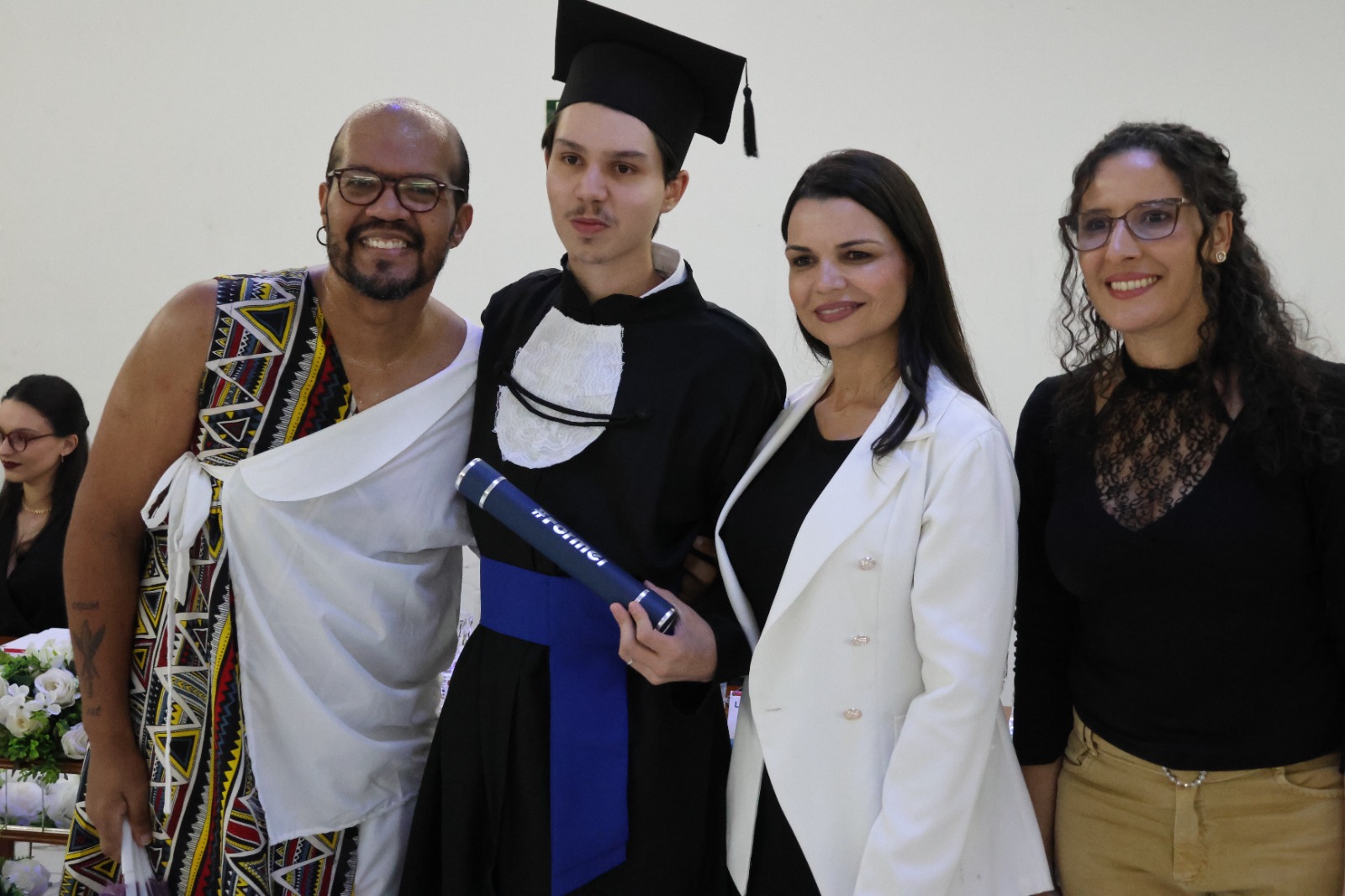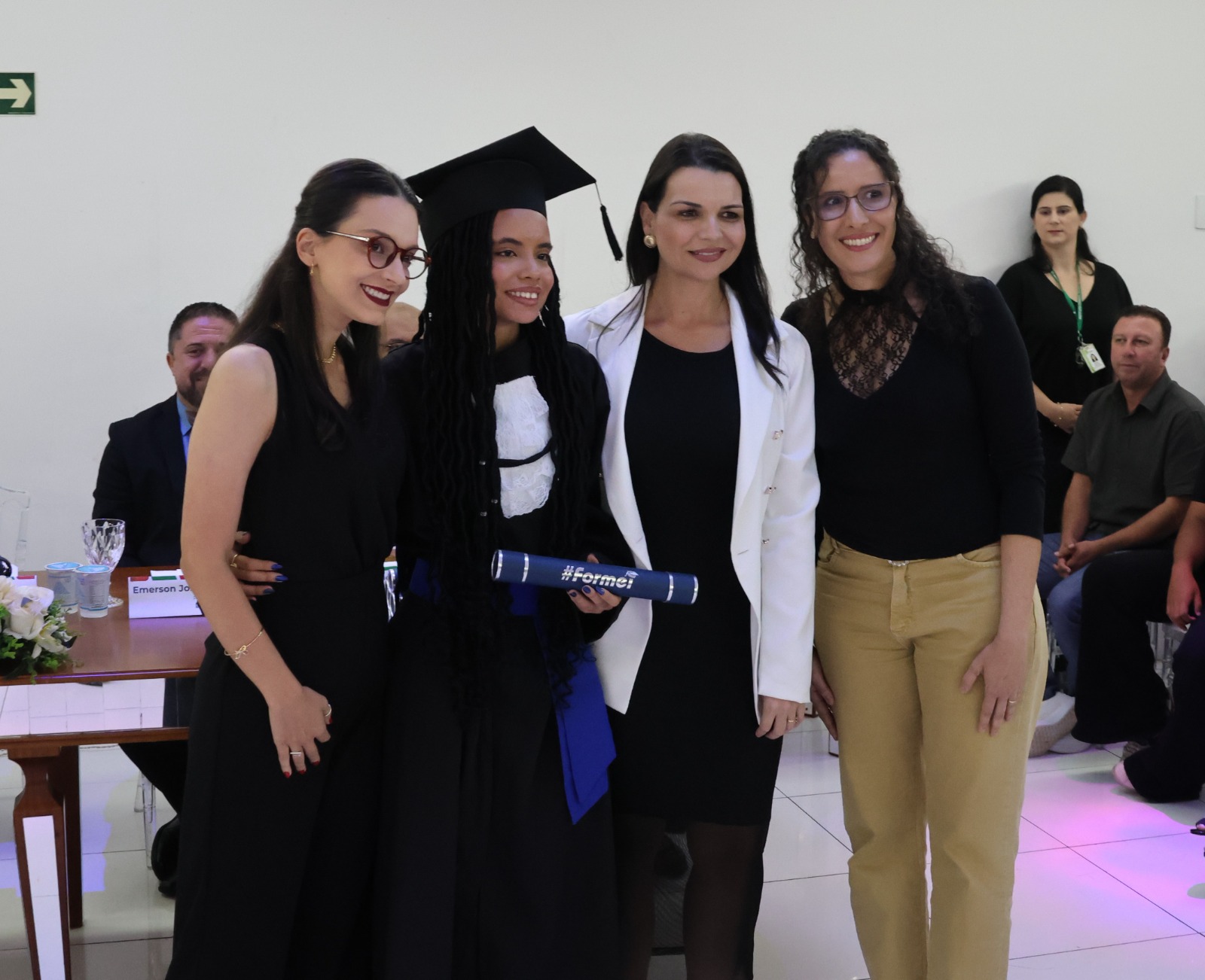 Compuseram a mesa diretora, a Pró-Reitora de Extensão, Professora Daniela Ferreira Cardoso; a Diretora-Geral Substituta, Eliane Silva Ribeiro; o Paraninfo das turmas do integrado, professor Emerson José Simões da Silva; a patronese Mariana Pereira; o patrono do curso subsequente, professor João Paulo Martins e as homenageadas, professoraa Adriana Falqueto Lemos e Tatiana de Freitas Silva.