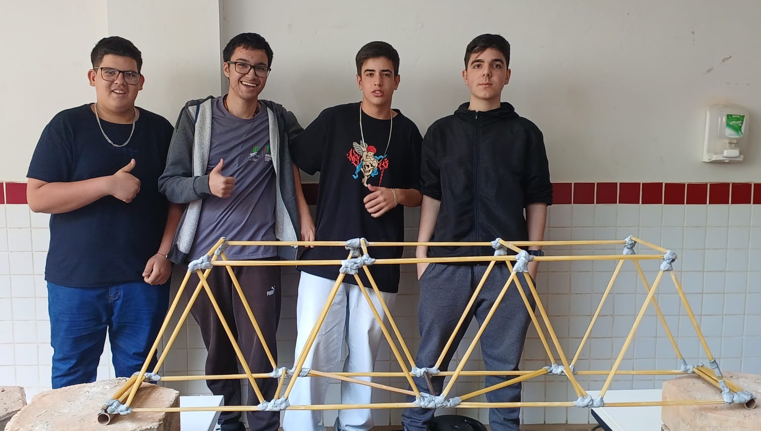 1º lugar - Equipe Engenheiros do Espaguete (Paulo Vitor Cabral, Leonardo Alexandre e Rafael Ferreira) – Ponte suportou 24 quilos